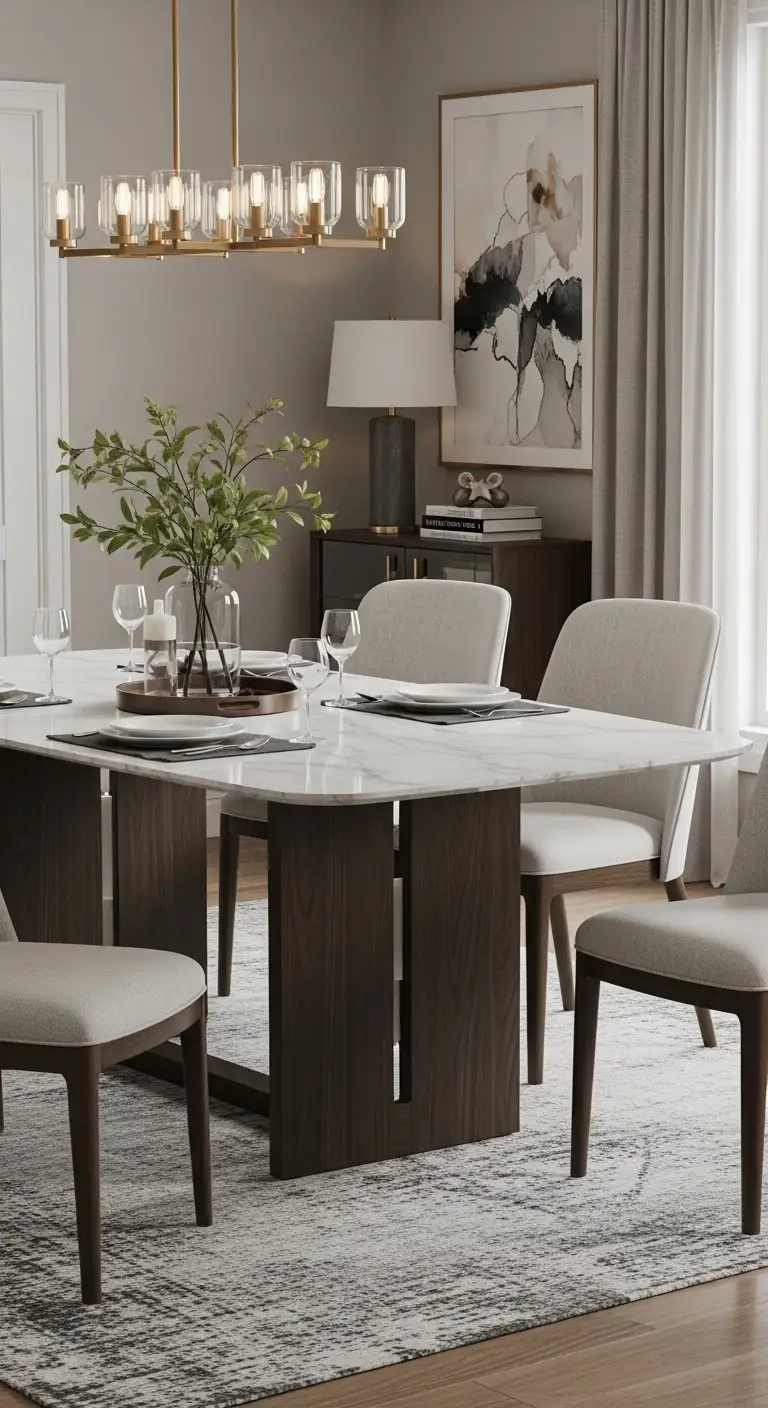 Warm lighting fixtures can soften the overall atmosphere while highlighting the table’s natural veining and elegant structure.