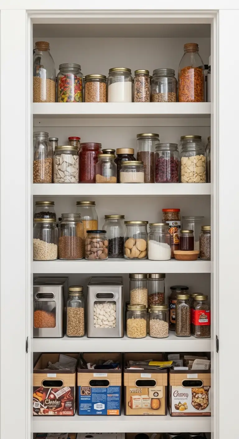 Overall, glass jars combine practicality and design, creating a pantry that feels organized, modern, and highly efficient for everyday use.