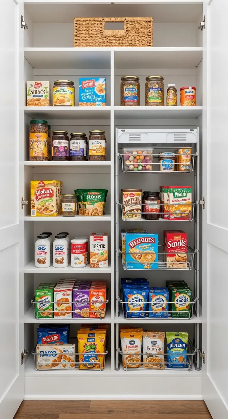This setup enhances pantry storage efficiency because users can quickly access snacks without disturbing other carefully arranged kitchen organization sections.