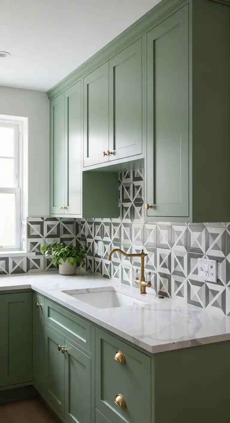 12. Mix Green Cabinets with Patterned Backsplash